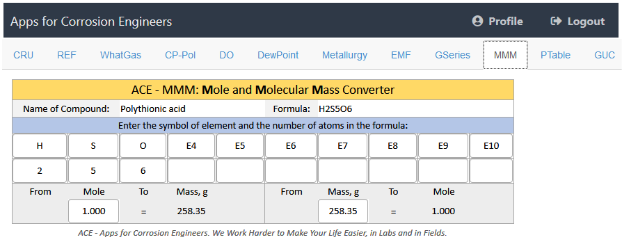 ACE-PWHT: Post-Weld Heat Treatment - Predict the equivalent carbon content (ECC) and the requirement for pre-heating or post-weld heat treatment. ACE-FAC: Flow-Accelerated Corrosion - Predict the chromium equivalent and the resistance to flow-accelerated corrosion. ACE-CRA: Corrosion Resistant Alloys - Predict the pitting resistance equivalent number (PREN) of corrosion resistant alloys, predict the application limits for temperature and chloride concentration. MMM: Mole and Molar Mass Calculator/Converter - Calculating/Converting mole and molar mass for all compounds.
