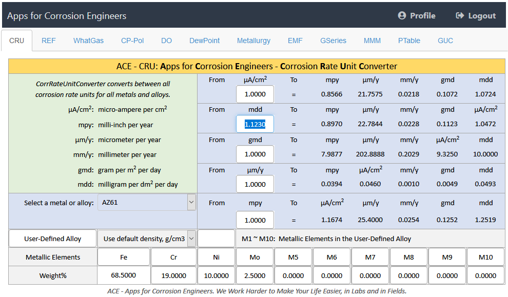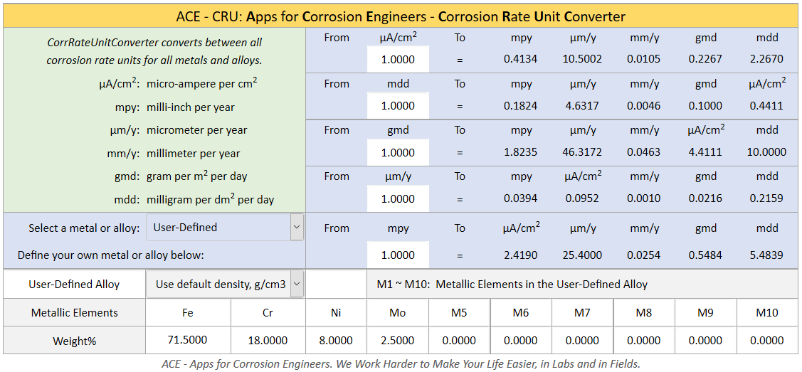 Detailed Feature Description of Apps for Corrosion Engineers CRU: Corrosion Rate Unit Converter - Converting between All Corrosion Rate Units for All Metals and Alloys Corrosion rate units commonly reported in the corrosion literature include: