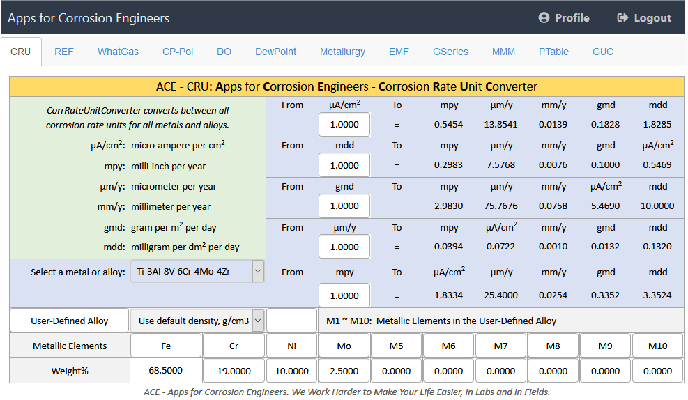 Converting the corrosion rate from one unit to another for comparison and for engineering applications is frequently required for numerous metals and alloys. For a given alloy, the conversion factors are different for each unit (µA/cm2, mpy, µm/y, mm/y, mdd, gmd); for a given unit conversion (e.g. mdd => mpy), the conversion factors are different for different alloys which are influenced by the density, chemical compositions, atomic mass of elements, and the valence of metallic elements in the alloy. Manual conversion requires multiple steps of calculation using a set of equations. The procedure is time-consuming and prone to errors, particularly for many engineering alloys that contain multiple metallic elements in their chemical compositions. Try to manually convert a corrosion current density of 1 µA/cm2 to mm/y for the titanium alloy Ti-3Al-8V-6Cr-4Mo-4Zr and see for yourself how long it takes you to get an accurate conversion.