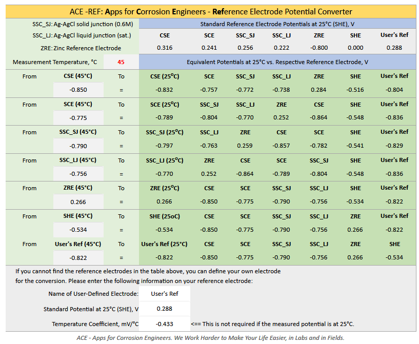 Figure 5 ACE-REF Reference Electrode Potential Converter for Cathodic Protection Applications ACE-REF can literally be a life-saver for cathodic protection contractors, cathodic protection technicians, cathodic protection technologists who are involved in meeting both the technical and the contractual requirements of cathodic protection criteria. Facility owners can use ACE-REF to instantly verify if the CP survey data meet the protection criteria at a specific location and in a specific season. Users of ACE-REF can easily define their own Reference Electrode scale for conversion. In Figures 4 and 5 above, the user-defined reference electrode named "User's Ref" has a standard potential of 0.288 V (SHE) at 25°C with a temperature coefficient of -0.433 mV/°C. |