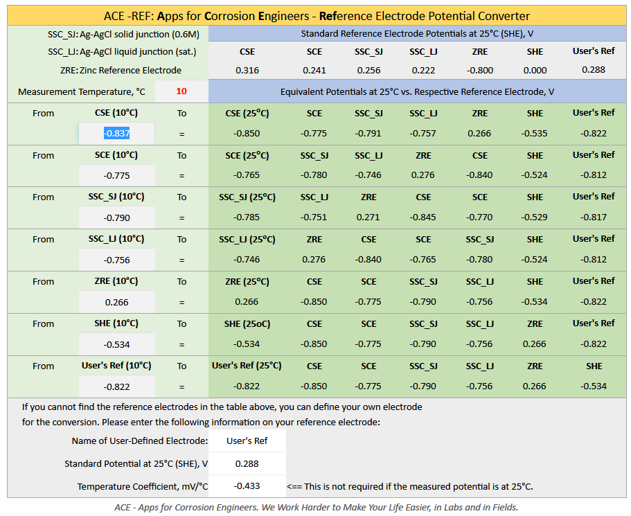 Figure 4 ACE-REF Reference Electrode Potential Converter with Temperature Correction Corrosion laboratories worldwide use a variety of reference electrodes for specific reasons. National and International cathodic protection standards use different reference electrodes for specifying cathodic protection criteria. Copper copper-sulphate electrode (CSE) is specified for cathodic protection of underground structures such as pipelines and storage tanks; silver-silver chloride electrode (SSC) is specified for cathodic protection of structures immersed in seawater; saturated calomel electrode (SCE) is most widely used in laboratories. Electrode potentials are sensitive to temperature. Potentials measured at temperatures other than 25°C have to be converted to equivalent values for cross-referencing and comparison. For example, Cathodic protection potential survey data are collect in the fields at seasonal temperatures (not the standard 25°C). It is essential that the CP system meets the protection criteria that is referenced to -0.85 V (CSE) at 25°C for a buried pipeline. The ACE-REF module instantly converts the measured potential at the measurement temperature to the equivalent potential at 25°C on commonly used reference electrode scale, or a user-defined reference electrode scale. Try to manually convert the potential of -0.850 V (CSE) measured at 45°C to the potential at 25°C on the SSC (SJ) scale and see how long it takes to get an accurate conversion. In ACE-REF, it take less than a second and the conversion is done for all common reference electrodes used in labs and in fields. In this example, the reading of -0.85 V (CSE) at 45°C does not meet the CP protection criteria as the equivalent potential at 25°C is -0.832 V (CSE), as shown in Figure 4 above. In contrast, a potential reading of -0.837 V CSE) at 10°C meets the cathodic protection criteria as the equivalent potential at 25°C is -0.850 V (CSE), as shown in Figure 5.