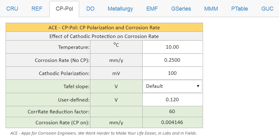 Figure 7 CP-Pol: Assessing the effect of CP polarization on the corrosion rate when CP is ON. A user simply enters the temperature and cathodic polarization, CP-Pol calculates the corrosion rate reduction factor. If the native corrosion rate (no CP) is known (typically less than 0.25 mm/y in soil or seawater), the corrosion rate when CP is on is calculated. CP-Pol allows users to enter the Tafel slope value for use in the computation. |