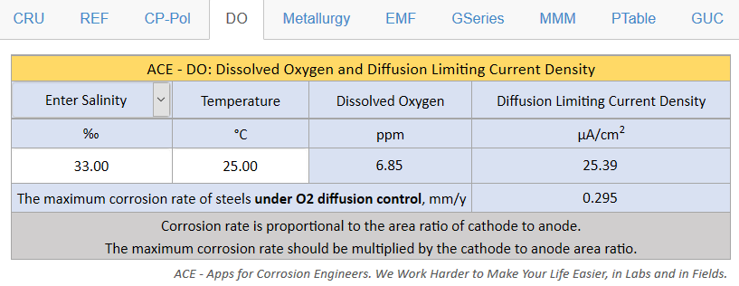 Figure 9 Calculation of Dissolved Oxygen and O2 Diffusion Limiting Current Density in Waters at a Specified Temperature. The solubility of oxygen in water is dependent on both temperature and salinity (salt concentration). The oxygen diffusion limiting current density and the corresponding corrosion rate in mm/y for carbon steels are predicted in this module. A user can use the CRU module to convert the diffusion limiting current density to the preferred corrosion rate unit for any metal or alloy. |