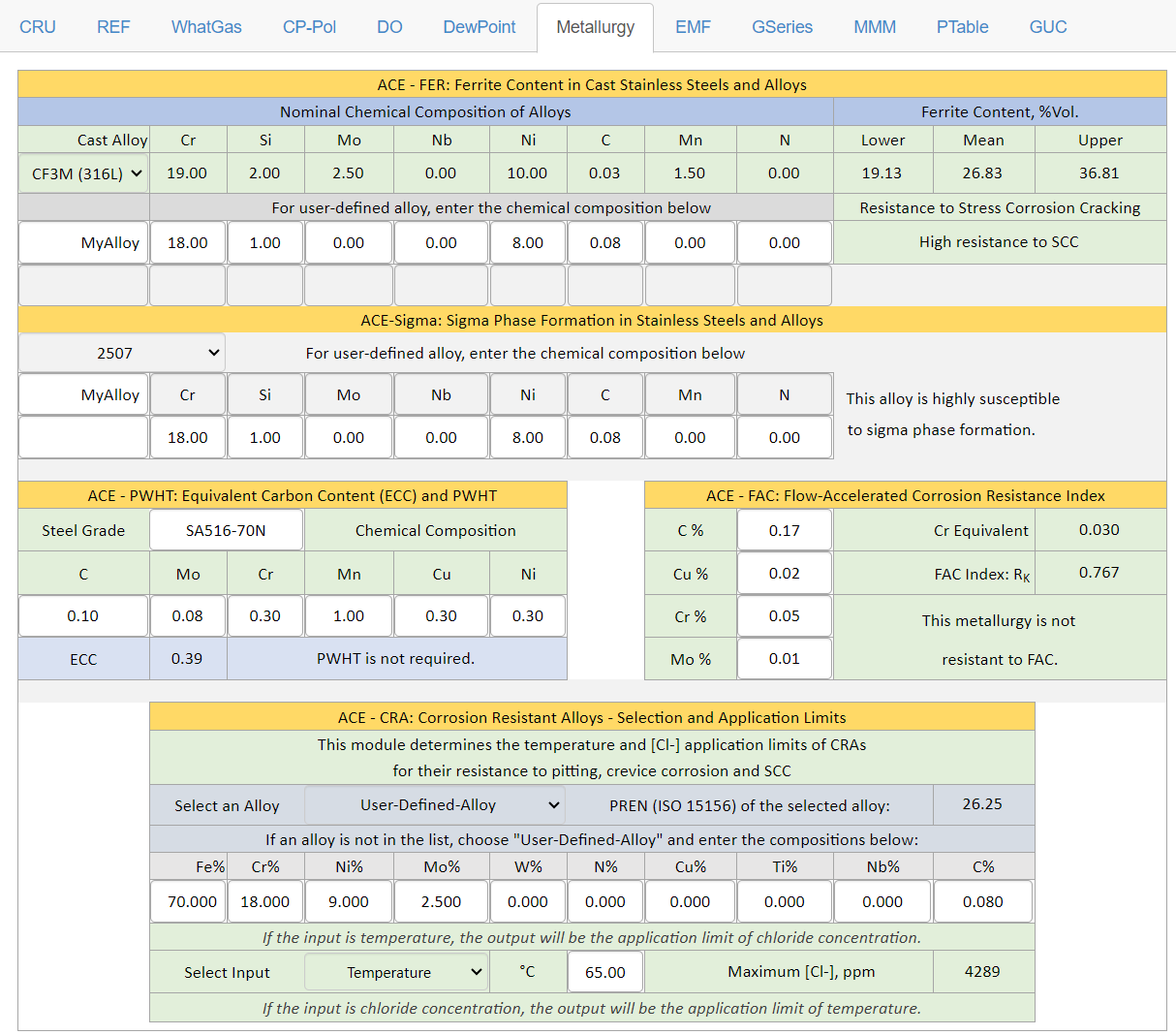 ACE Overview | CRU | REF | WhatGas | CP-Pol | DO | DewPoint | Metallurgy | FER | Sigma | PWHT | FAC | CRA | MMM | EMF | GSeries | PTable | GUC |